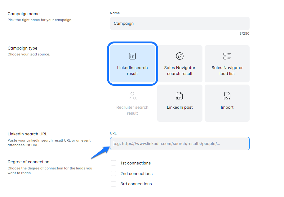 In Lead Loader, paste your LinkedIn search URL into the designated area. Give your campaign a name that resonates with your goals.