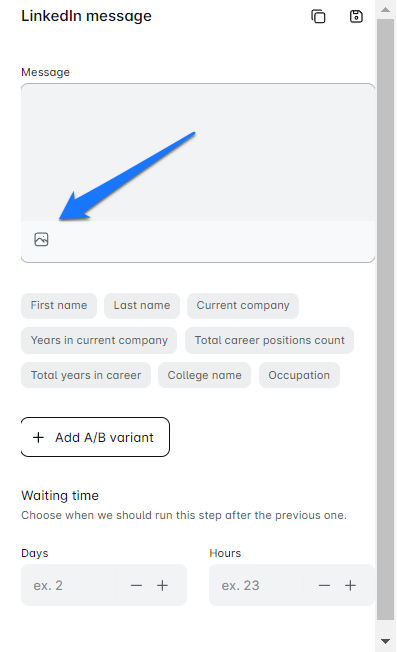 - For email messages, choose where to insert your image or GIF. For LinkedIn messages and InMails, Lead Loader will place your personalized images and GIFs at the bottom of the message.