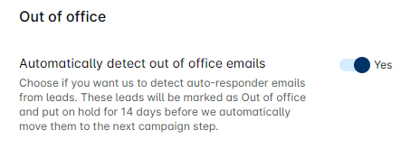 π Enable Automatic Handling of 'Out of Office' Emails: When you turn on this feature, our platform automatically detects when a prospect sends an 'Out of Office' auto-response. π The prospect's status is then updated to 'Out of Office,' and theyβre seamlessly reintegrated into the campaign 14 days later, ensuring no follow-up opportunities are missed! β°
