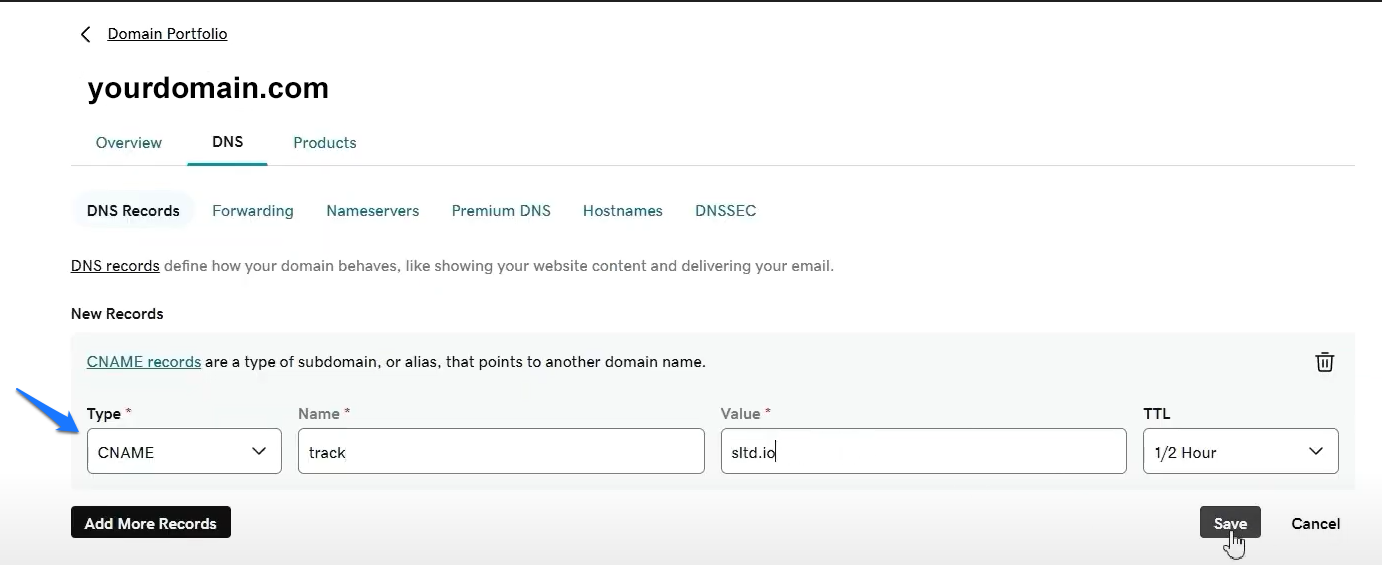 - This time, under record type in the dropdown menu, find CNAME, and paste the details provided in Lead Loader’s Custom tracking domain settings.